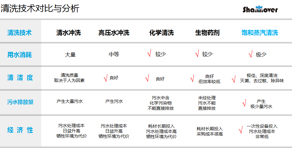 節(jié)水:相對(duì)于其它以水為介質(zhì)的清洗方法,蒸汽清洗耗水量極低。