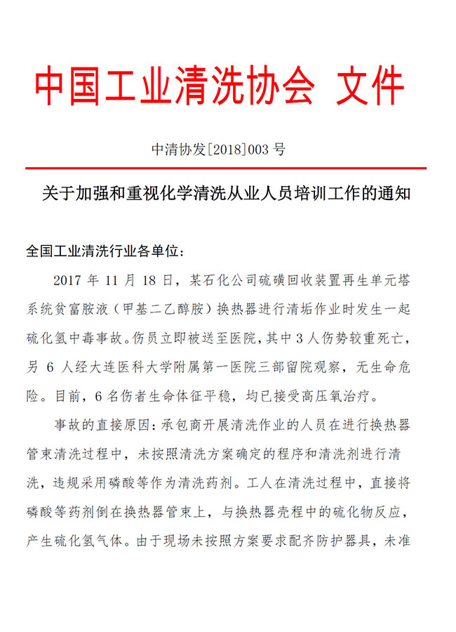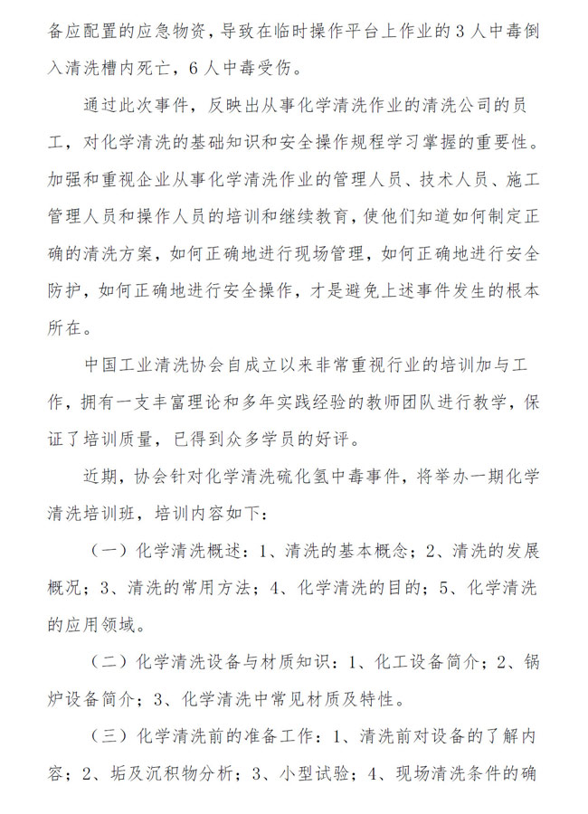 近日,工業清洗行業發生的硫化氫中毒致死致傷事件引起國家相關部門的重視,要求我協會在行業內加強化學清洗培訓,尤其是安全方面的培訓工作,我協會起草了《關于加強和重視化學清洗培訓工作的通知》,現予發布。