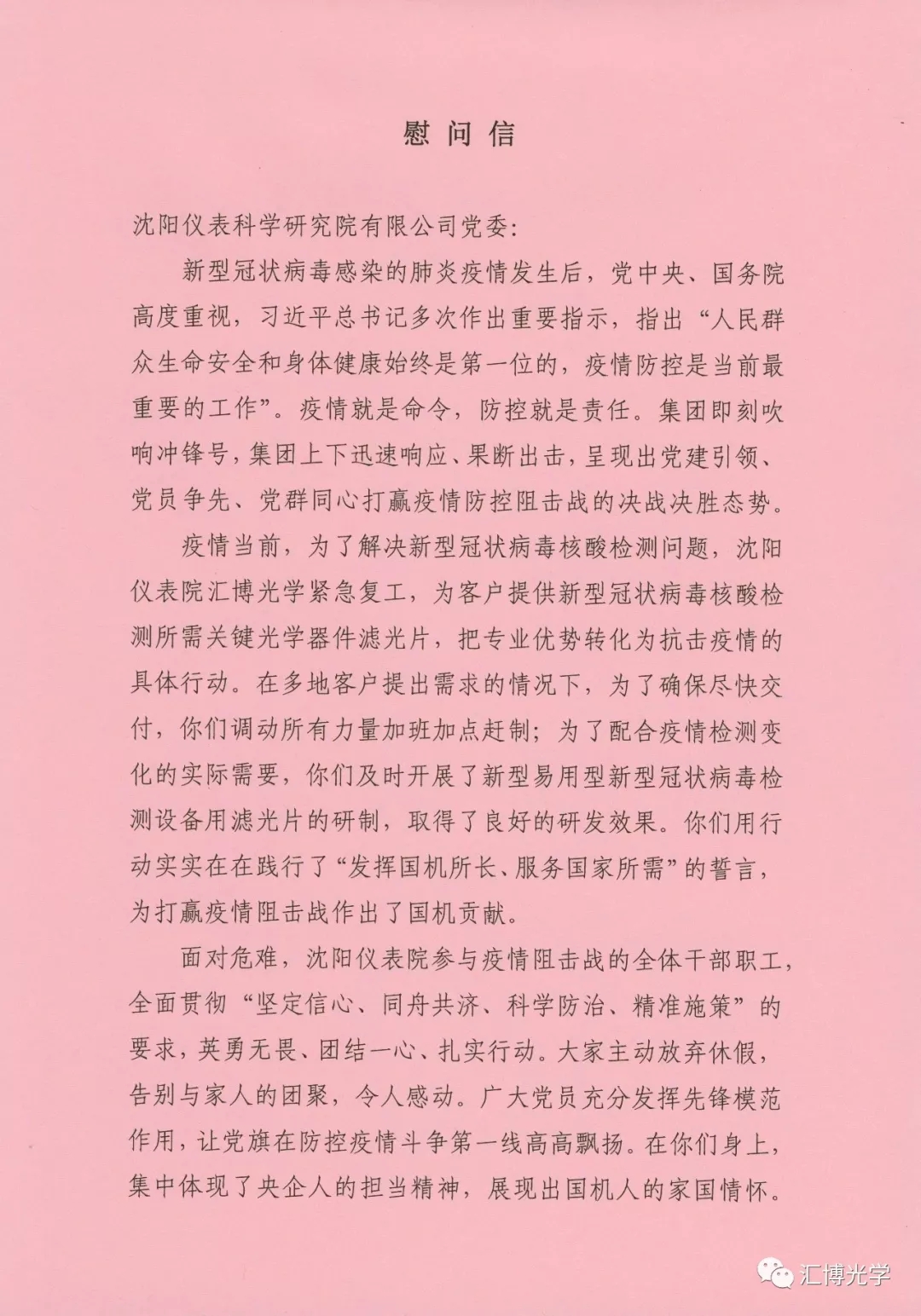 集團黨委慰問信中特別提到,疫情當前,為了解決新型冠狀病毒核酸檢測問題,沈陽儀表院匯博光學緊急復工,為客戶提供新型冠狀病毒核酸檢測所需關鍵光學器件濾光片,把專業優勢化為抗擊疫情的具體行動。在多地客戶提出需求的情況下,為確保盡快交付,你們調動所有力量加班加點趕制;為配合疫情檢測變化的實際需求,你們及時開展新型易用型新型冠狀病毒檢測設備用濾光片的研制,取得了良好的研發效果。你們用行動實實在在踐行了“發揮國機所長、服務國家所需”的誓言,為打贏疫情阻擊戰作出了國機貢獻。