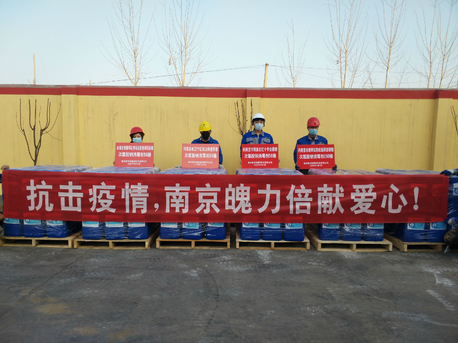 在貨源緊張,物流停運的情況下,魄力倍公司努力克服困難,提前安排化學品部門員工上班,并加班加點生產疫區急缺的消毒品。在南京市建鄴區防疫指揮部等領導的幫助下,公司第一批捐贈200桶計5噸次氯酸鈉消毒劑已經陸續使用。此外,公司還向南京市江寧區東山街道辦、秦淮區紅十字基金會分別捐贈50桶,合計2.5噸氯酸鈉消毒劑,用于疫情防控。